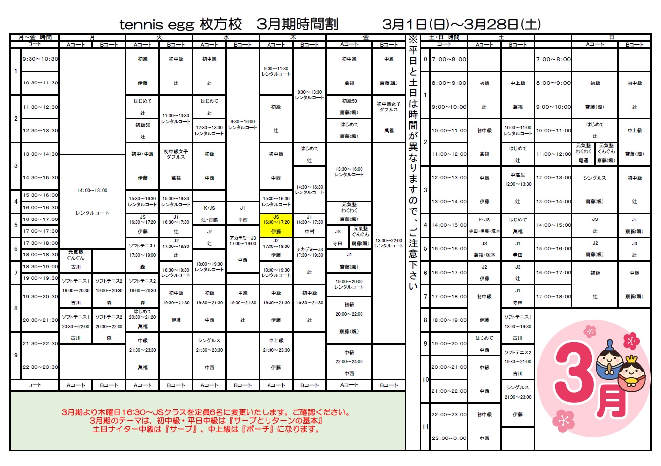 3月期より木曜日16:30〜JSクラスを定員6名に変更いたします。ご確認ください。 PDFはこちら